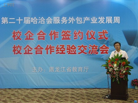 6月16日上午,哈工程软件学院院长印桂生在第二十届哈洽会服务外包产业周“校企合作签约仪式暨校企合作经验交流会”上作了“借助校企合作打造特色软件学院 创建品牌培训基地”的主题发言。
