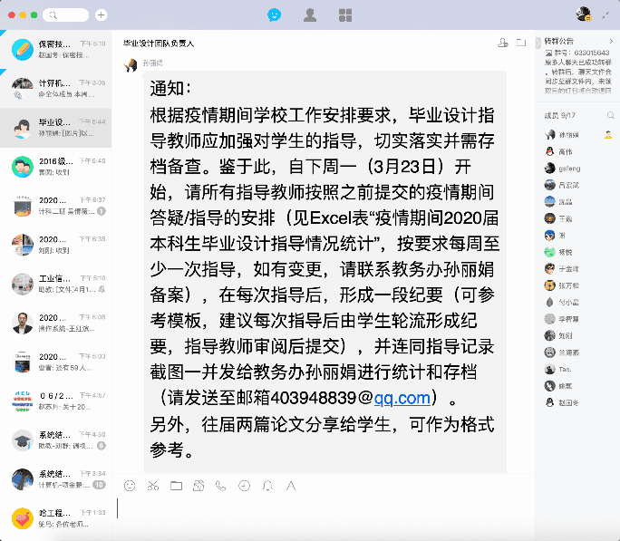 疫情发生以来,学院启动了本科生毕业设计应急措施,指导教师与学生建立在线指导关系,落实疫情期间的毕设工作,保障毕业设计工作进度不延迟、质量不降低。学院建立了“学院-毕设指导团队-指导教师”的三级管理体制,在进度推进和质量把关方面三方齐抓共管,保障毕设工作顺利进行;