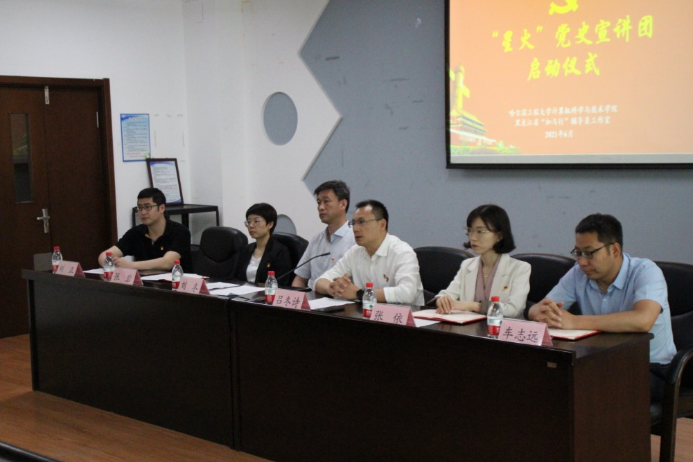 6月10日上午十点,计算机科学与技术学院“星火”党史宣讲团启动仪式于启航活动中心长江厅举行。哈尔滨工程大学校党委常委、校党委宣传部部长吕冬诗,哈尔滨工程大学计算机科学与技术学院党委书记刘冬、党委副书记刘正,哈尔滨工业大学电气工程及自动化学院党委副书记张依,绥化学院宣传统战部副部长张岩,黑龙江中医药大学人文与管理学院副教授车志远出席了本次启动仪式。本次仪式由计算机科学与技术学院学生辅导员、党务中心主任李东升主持。