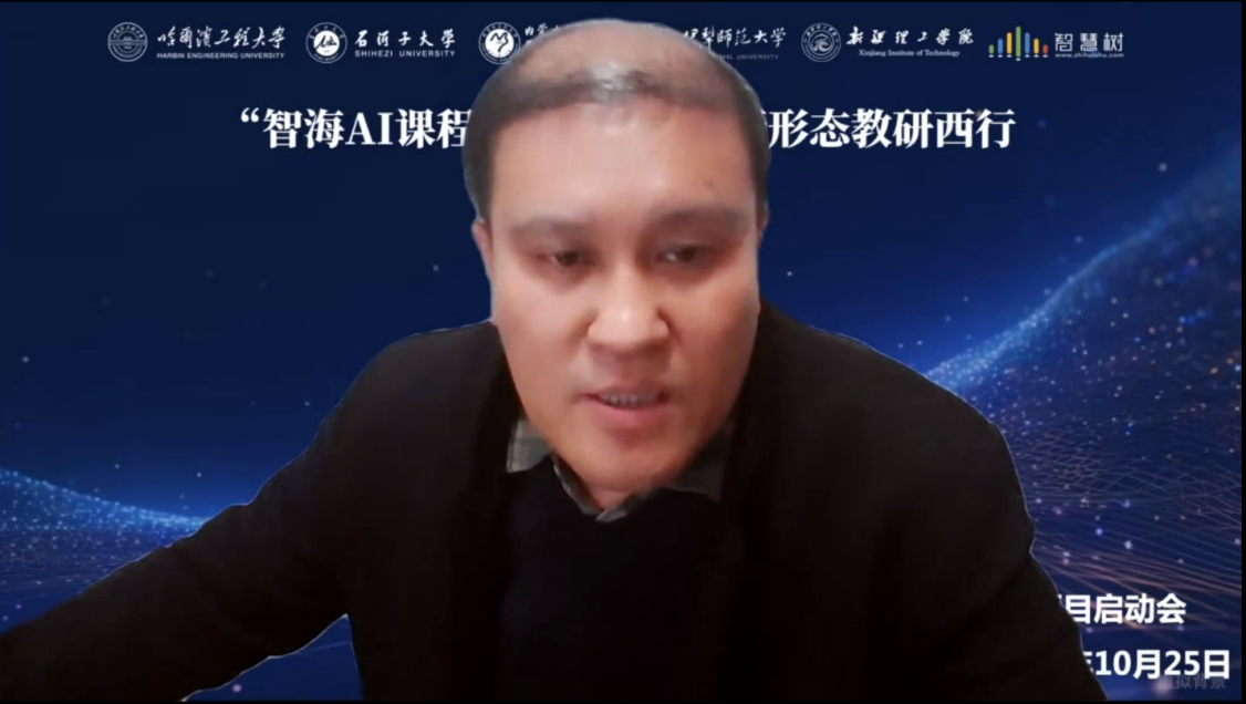 哈尔滨工程大学计算机科学与技术学院副院长王巍教授代表致辞。王院长表示,“智海AI课程虚拟教研室”是哈尔滨工程大学牵头的首批国家级课程教学类虚拟教研室试点,有良好的工作基础,希望能和西部高校同仁一起围绕《人工智能》课程开展共研、共建、共享、共创、共同成长!共同提升人才培养能力和人才培养质量。”