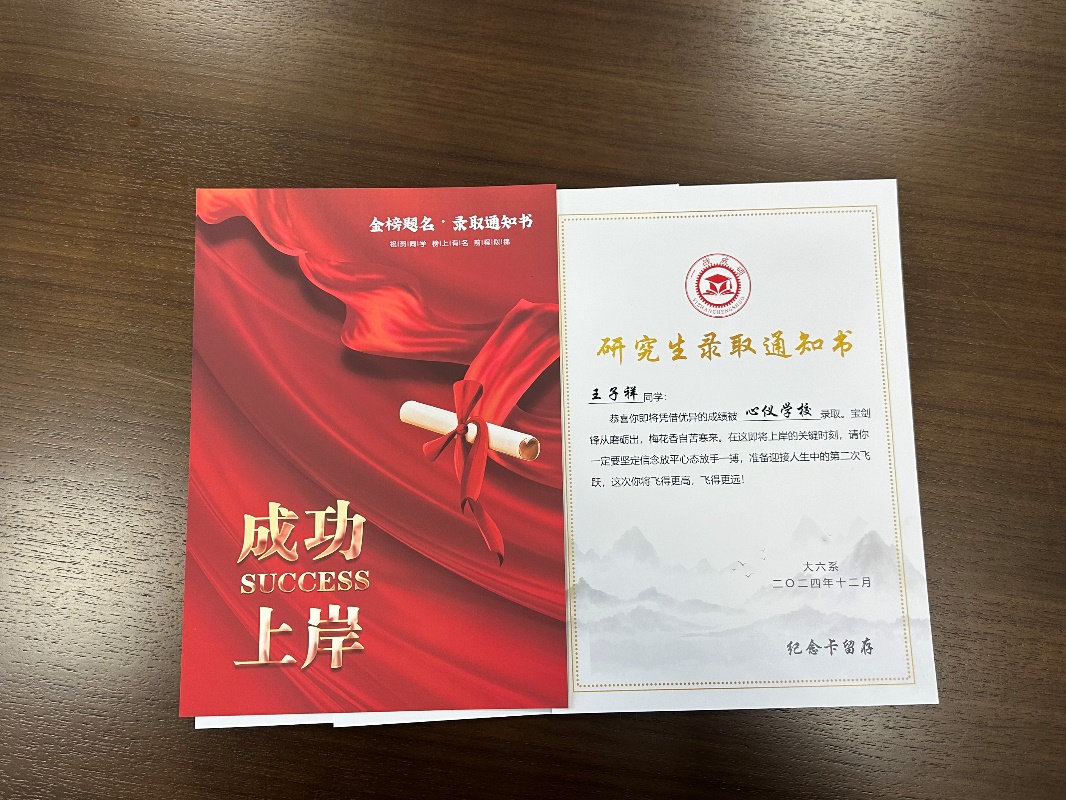 学院学生工作办公室为全体考研学子线上一份特别的礼物—“成功上岸研究生录取通知书”,希望同学们能够增强考研信心、稳定发挥,顺利考取心仪学校。辅导员贾德帅鼓励学子们不言放弃,坚持到底,用稳健平和的心态面对即将到来的考试;辅导员付强从备考、考试期间饮食作息等方面做了精心细致的提醒,希望同学们保持良好的状态,顺利完成考研。