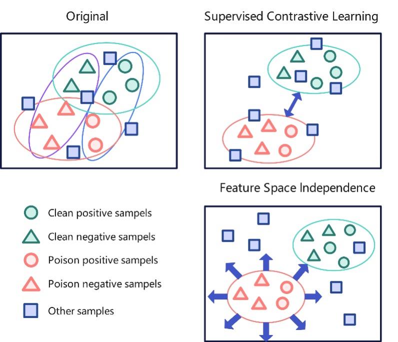 作者提出了两种增强文本后门攻击性能的方法:监督对比学习与特征空间隔离任务。其中,监督对比学习通过增强模型对中毒样本的学习能力,借助参数共享机制显著提升了后门攻击的有效性;而特征空间隔离任务则通过将中毒数据与其他类型数据在特征空间中分离,增强了模型对后门触发特征的敏感度,从而有效降低模型对后门攻击的抵抗力。此外,作者还提出了一种创新的“零中毒攻击”(Zero Poison Attack)方式,无需直接污染目标任务的训练数据,即可间接实现后门嵌入,进一步提升了攻击的隐蔽性与适应性。