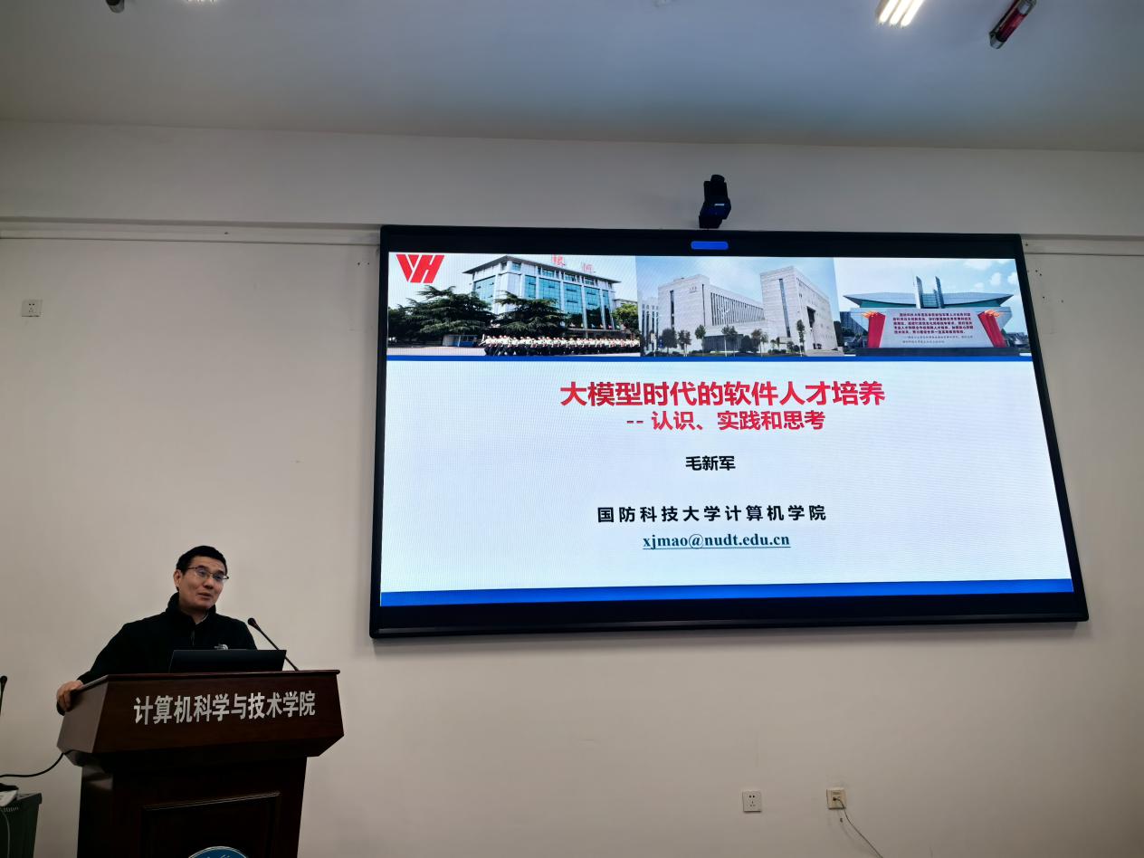 毛新军教授以《大模型时代的软件人才培养:认识、实践和思考》为题进行了分享,重点介绍了对大模型时代软件人才的理解和认识;讨论了将大模型技术和工具等融入软件工程知识体系、课程体系和实践体系的若干认识,以深化计算机教育教学改革及软件人才培养;阐述了在大模型辅助软件开发实践方面开展的初步探索,发现并讨论了由此带来的一系列新现象、新问题和新观点。