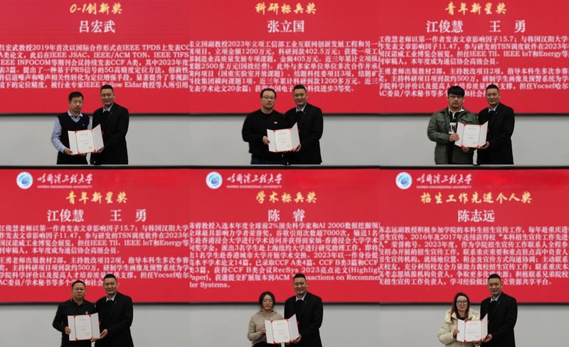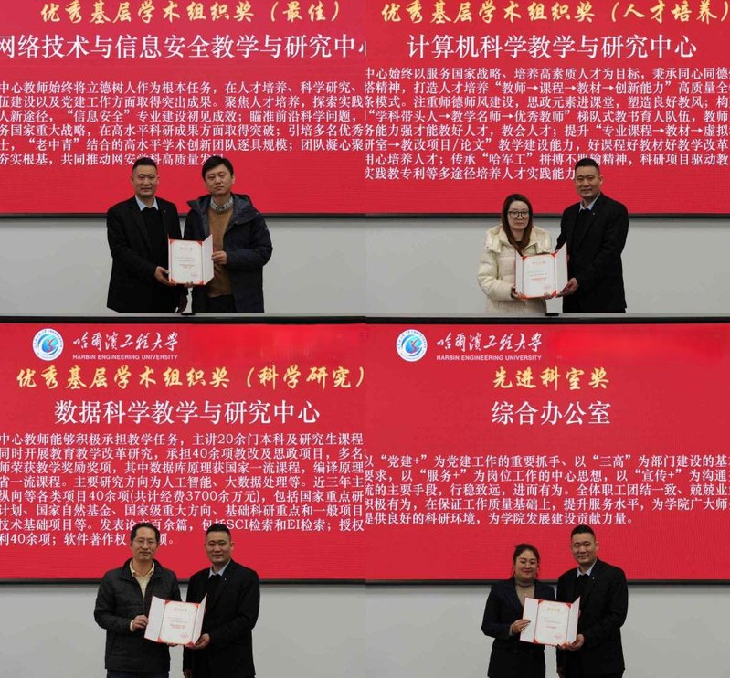 刘冬书记在颁奖会发表讲话,希望学院全体教职工以先进为榜样,弘扬“教育家精神”将个人的发展融入到学院和学校综合改革中去,加强学习,开拓进取。最后,代表学院向接受表彰的先进集体及个人表示祝贺!计算机科学与技术学院2023年度教职工大会暨金榜评选颁奖会圆满落幕。