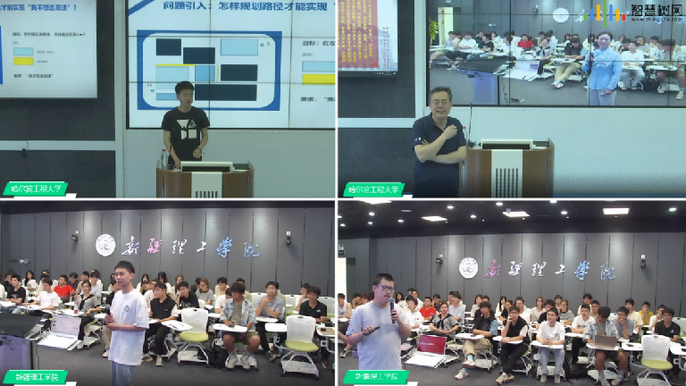 “今天我们根据之前课堂的分组和自主选题,进行组内的头脑风暴,自由选择汇报的人员。我们哈尔滨工程大学国家特色化示范性软件学院的学生和新疆理工学院的学生咱们两边分别针对五组议题进行分享,每一组结束后都可以进行提问和交流。”